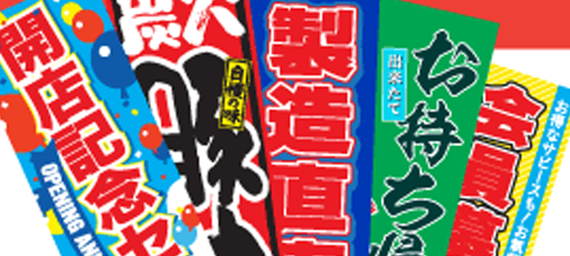 のぼりや横断幕などお店の販促に欠かせないツールもご用意しております。店頭のツールはデザインが重要なものです。集客に繋がる弊社の販促物をお選びください。